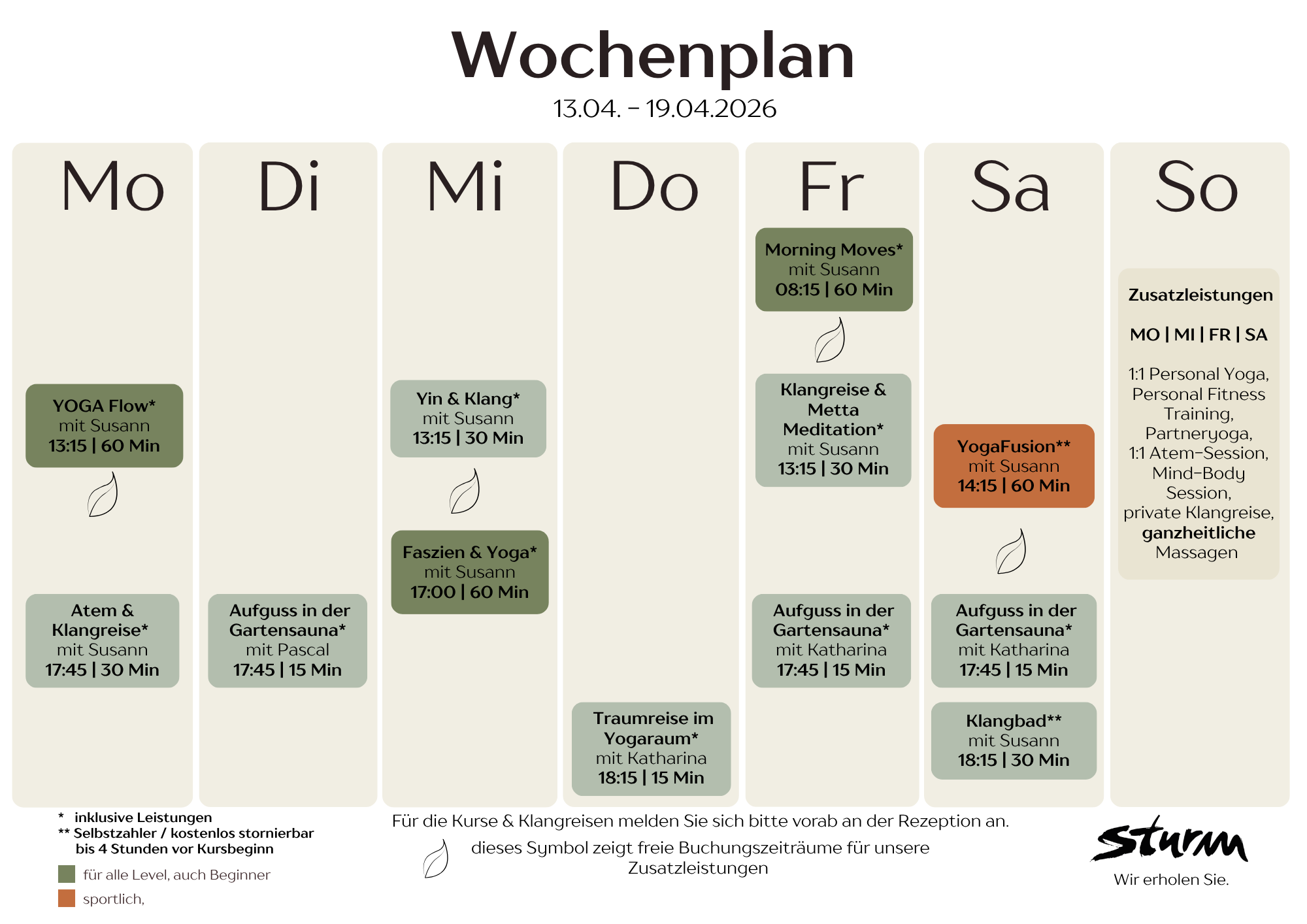 Ihre private Gesundheits- und Fitnessauszeit bei uns im Sturm. Gönnen Sie sich eine maßgeschneiderte Auszeit für Körper und Geist – ob privat, mit Freunden oder als Team-Event! Ab vier Personen können Sie Ihr eigenes Datum wählen und Ihr individuelles Programm zusammenstellen lassen von uns. Ob belebendes Yoga, Stressmanagement, intensive Sporteinheiten oder eine entspannende Kräuterwanderung – wir gestalten Ihr Angebot perfekt nach Ihren Wünschen. Fragen Sie nach mehr Infos und sichern Sie sich Ihre persönliche Auszeit!